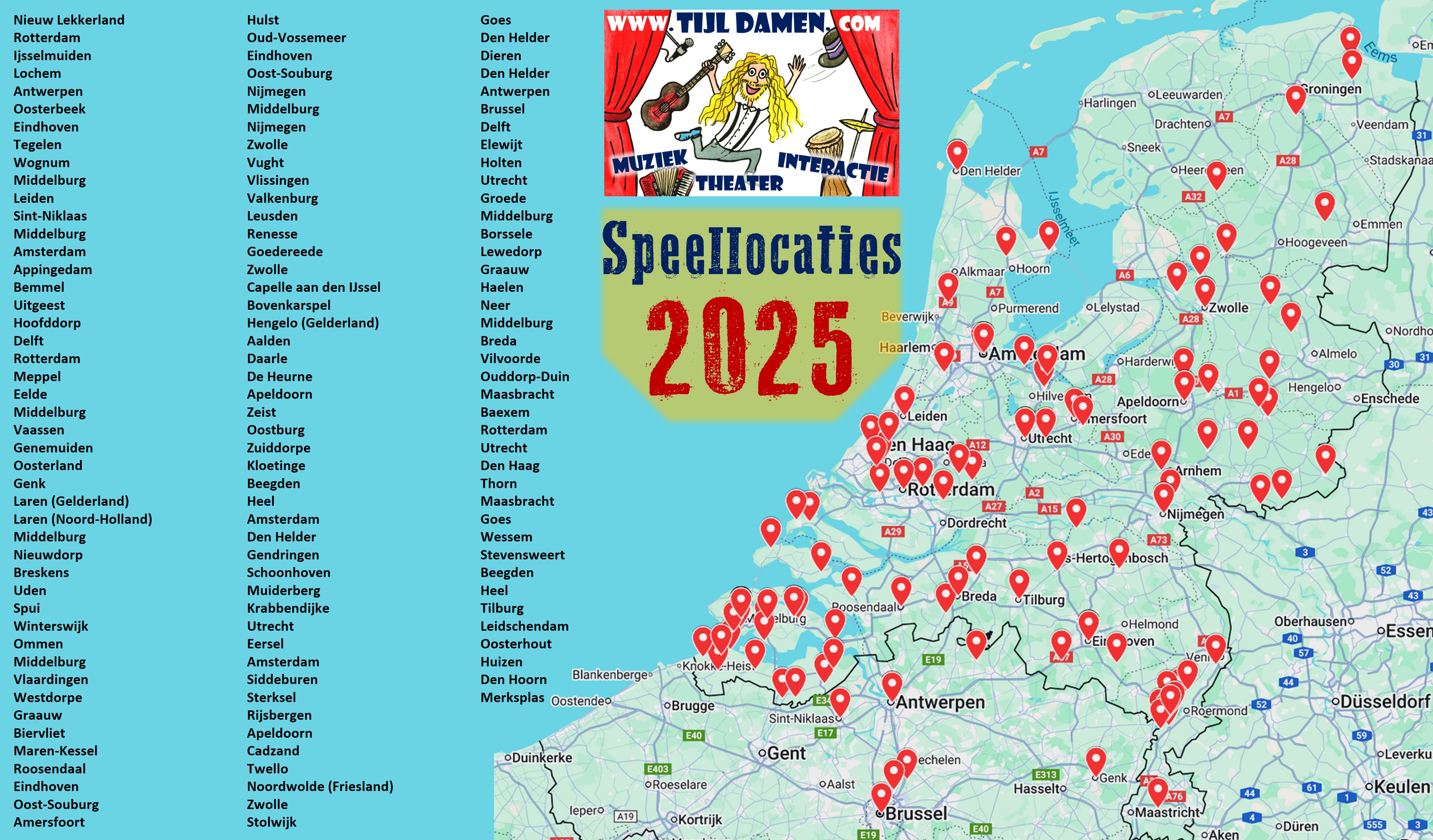 Tijl speelt zijn voorstellingen op locatie in HEEL NEDERLAND EN VLAANDEREN en dan ook nog eens ZONDER REISKOSTEN in rekening te brengen!